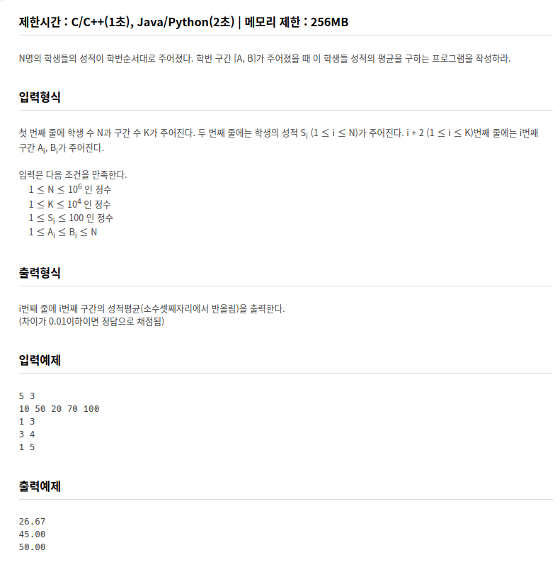 조금 꼬았나? 싶었는데 아무리 봐도 단순 연산문제 + 소수점 처리하기인 것 같아서 그렇게 풀어봤는데 잘 풀린다. 입력에서 둘째줄은 성적이니까 성적 리스트로 입력해두고 나머지 구간들도 for문으로 처리하면 좋으니까 이중 리스트 형식으로 입력받는다. 그 다음 구간들마다 입력돼있는 인덱스를 활용해서 성적 리스트를 슬라이싱하고 적절히 sum함수를 사용하면 퍽 쉽게 풀린다. 마지막에 소수점 두자리까지 표현하는 부분이 생소하다면 생소할 수 있는 부분이다. 처음에는 round함수를 써야하나 했는데 뒤에 소수점이 없는 경우에도 00을 나타내야해서 format함수를 이용해 00을 붙여줬다. 아무 문제없이 잘 풀리긴 했는데 뭔가 최적화를 하려면 할 수도 있는 수준의 결과인 것 같기도 하고...