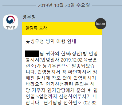 뭐 아무튼, 나는 학교를 다녀서 자동으로 연기가 됏고, 대학을 졸업하고 대학원을 가기 전 1년정도 시간이 비었는데 이 때 12월 입영통지서가 문자로 왔다. 신체검사 통지는 편지로 오지만 입영통지서는 카톡으로 먼저 오고 우편으로 온다.