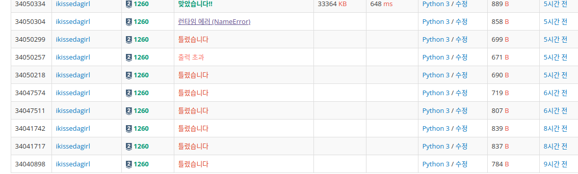 아니 자꾸 11프로에서 답이..안넘어가는겨 ㅜㅜ 근데 가장 충격적이었던건 메모리초과/시간초과가 아니라 '틀렸습니다'...
