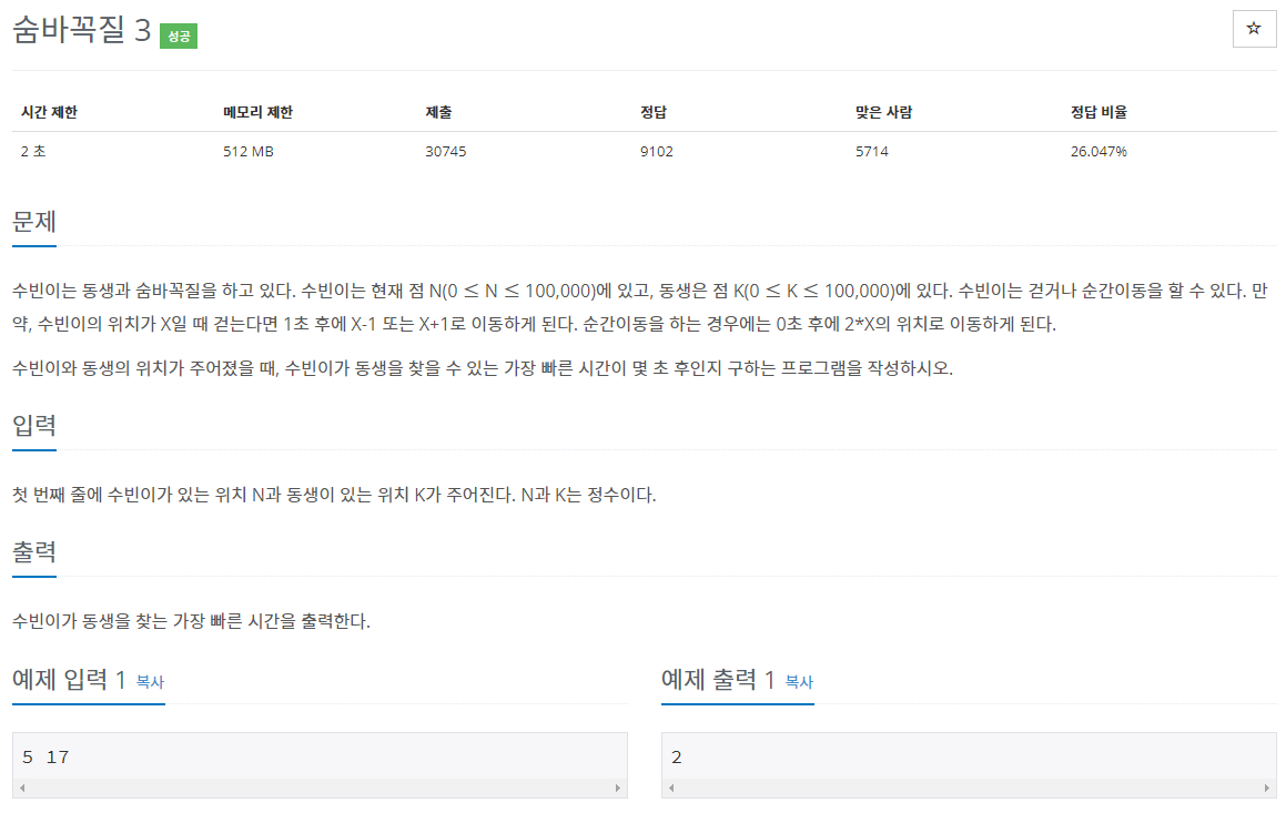 숨바꼭질2 문제와 많이 비슷하다. 숨바꼭질2 문제와 다른점은 이번엔 2*x의 위치로 가는 경우에는 시간추가가 되지 않고, 그리고 움직이는 경우에 따라 움직이는 횟수와 관계없이 시간에 차이가 생기게되면서 이번엔 최소의 시간..값을 찾는 프로그램을 만들어야 한다.