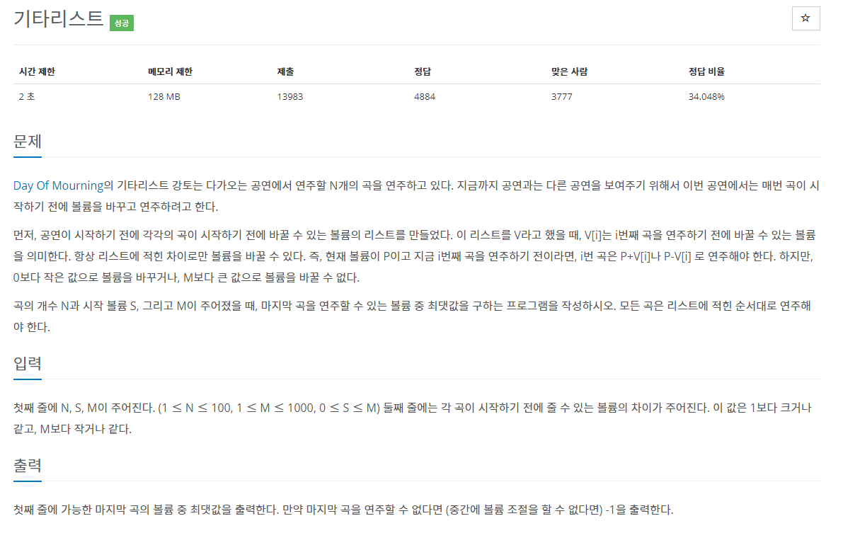 얼핏 보면 bfs문제같은데 시간초과로 bfs는 안된다. 생각해보면 계속 갯수가 2씩 곱해지고 최대 100번 반복해야하니까 최악으로는 가장 마지막 경우에 2^N개의 값을 계산해야될 수도 있다(O(2^(N^2))). 따라서 매 곡 순서마다 가능한 음량을 체크하는 리스트를 만들어서 가능한 음량을 체크하는 형식으로 계산하면 반복문을 활용, O(NM)으로 문제를 풀 수 있다.
