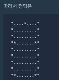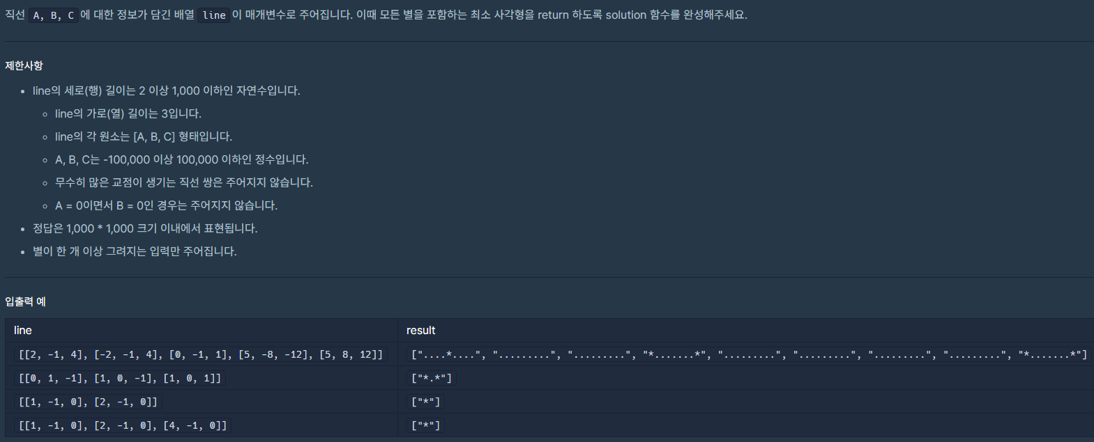 문제는 간단하다. ax+by+c = 0 꼴의 방정식을 이루는 a,b,c 쌍들이 주어지고 모든 방정식의 교점을 구해 그 중 정수의 x좌표 y좌표를 갖는 경우에 한해서 * 처리를 하고 나머지 범위는 모두 '.' 을 입력한다. 이 때, 모든 별을 포함하는 가장 작은 직사각형 만큼은 '.'을 찍어야하고, 이 때 위와같이 문자열 리스트를 만들어서 리턴해야한다. 요새 백준만 풀다보니까 리턴하는게 어색했달까