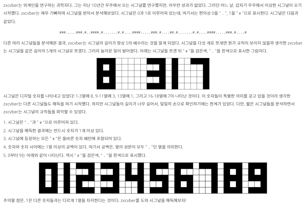 맨 윗쪽 줄의 맨 왼쪽 값부터 시작한다. 만약 현재값이 '#'이면 해당칸을 포함해서 3열 * 5행만큼의 칸이 어떤 수인지 확인한다. 만약 해당 값이 1이면 오른쪽으로 2칸만 움직이고, 그 외의 값은 3칸씩 모두 사용하므로 4칸을 옮겨서 다시 그 값이 '#'인지 확인한다. 공백이 1칸 이상이므로 만일 해당 값이 ' . ' 이면 오른쪽으로 1칸만 움직인다.