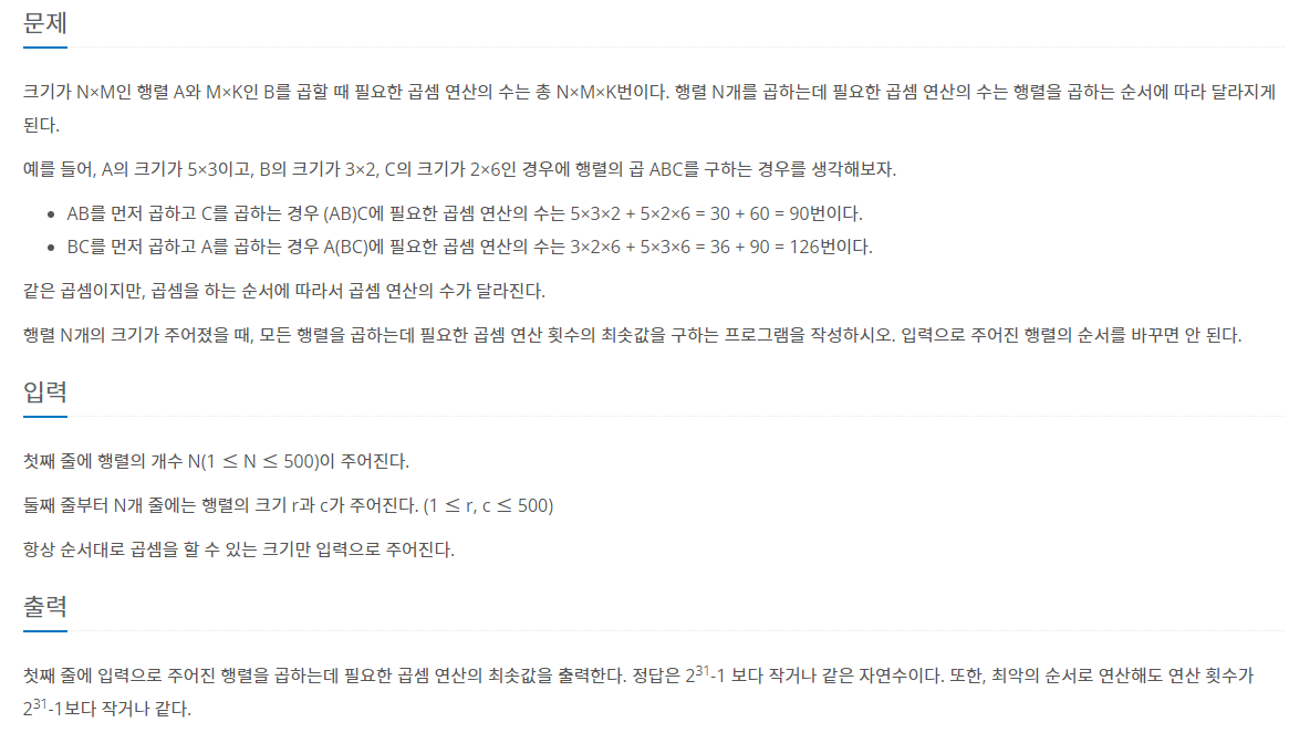 행렬의 경우 분배 법칙..이라고 해야하나? 아무렇게나 막 곱해도 값이 똑같은 그런 규칙이 적용되지 않아서 곱셈 순서에 따라 값이 상당히 달라진다. 그래서 그 규칙을 적용했을때의 최소값을 구하라는 문제이다. dp를 활용하는 문제.