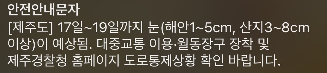 아 그리고 오늘부터 며칠간은 대설주의보라고 한다. 작년에 눈 엄청 많이 왔던걸 생각해보면 올해에는 눈이 너무 안 오긴 했지. 제주가 원래 이렇게 추웠었지 맞아, 하는 생각이 들었다. 특히 순찰할땐..ㅋㅋㅋㅋㅋ