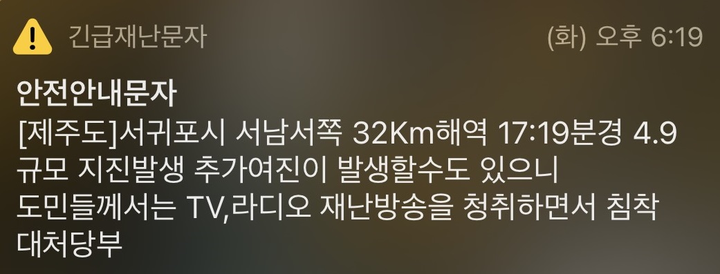 2. 14일에 제주 서남쪽 해안에서 지진이 발생했다. 나는 그냥 길을 걷고 있었는데 갑자기 땅이 흔들리고 건물들이 흔들려서 2초정도.. 뭐지? 하다가 설마 지진인가??????????했다. 아니 여기에 일년을 더 살았는데 여태 아무 일도 없다가 갑자기 지진이 난다고?ㅋㅋㅋㅋㅋㅋㅋㅋ아니 말이 안되잖아 ...............ㅋㅋㅋㅋ 당황스럽지만.. 제주지역에 큰 데미지는 없엇어서 다행이다.