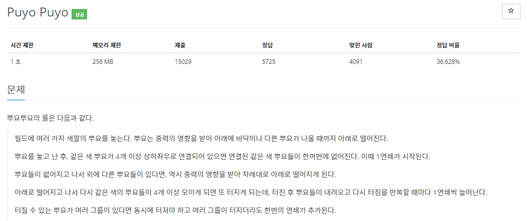 대충 이런 문제이다. 12*6짜리 행렬의 입력이 주어지는데 Y나 R같은 문자들은 색을 나타낸다. 그리고 같은 색이 4개 이상 상하좌우로 붙어있으면 사라지고 그 사라지는 횟수를 카운트 한다. 색이 사라지면 윗쪽에 있던 것들이 아래로 내려오고 거기에서 다시 같은 색이 4개 붙어있는지 확인한다. 더이상 사라질 수 있는 뿌요가 없으면 끝. 같은 색의 4개짜리 그룹이 한번에 여러개 있을 경우 한번에 다같이 터지고 이 때 1만 카운트 된다.