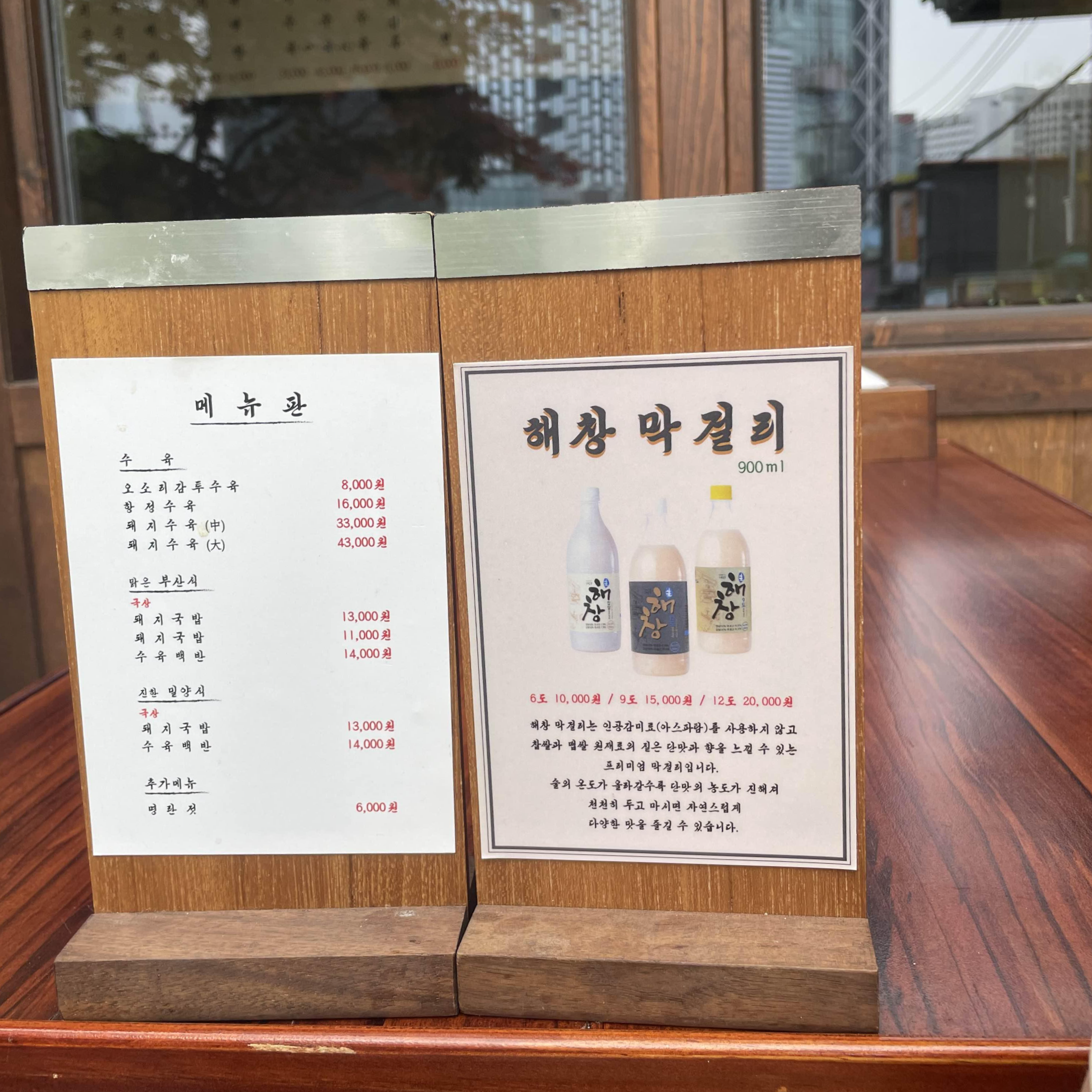 메뉴는 대충 이런 느낌입니다. 엄청다양하진 않아요. 5시 오픈이라고 해서 십분정도 일찍 갔는데 실제로 들어간건 5시 5분정도? 서빙 직원분들이 좀 ..일을 열심히안하는 느낌입니다. 자기들끼리 친해보이고 그런건 좋은데 5시 넘겨서야 테이블에 이것저것 채우고 하는 모습은 보기 좋지 않았습니다. 밖에 기다리고 있는거 뻔히 알면서도 ^^; 해장국집만 가도 서빙인원 한두명으로도 이렇지 않은데말이죠.